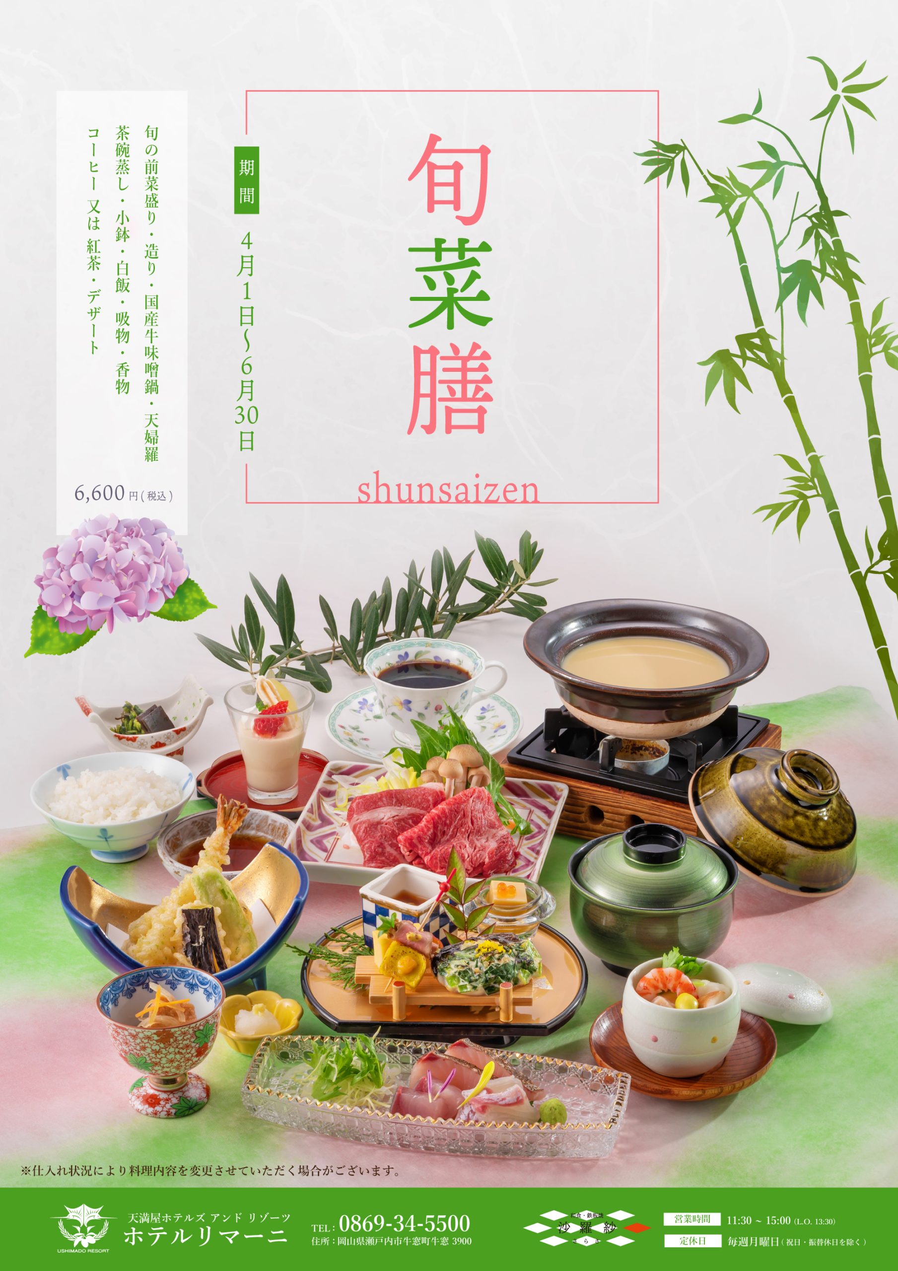 Savor the finest seasonal ingredients from Ushimado, crafted with care by the chef.